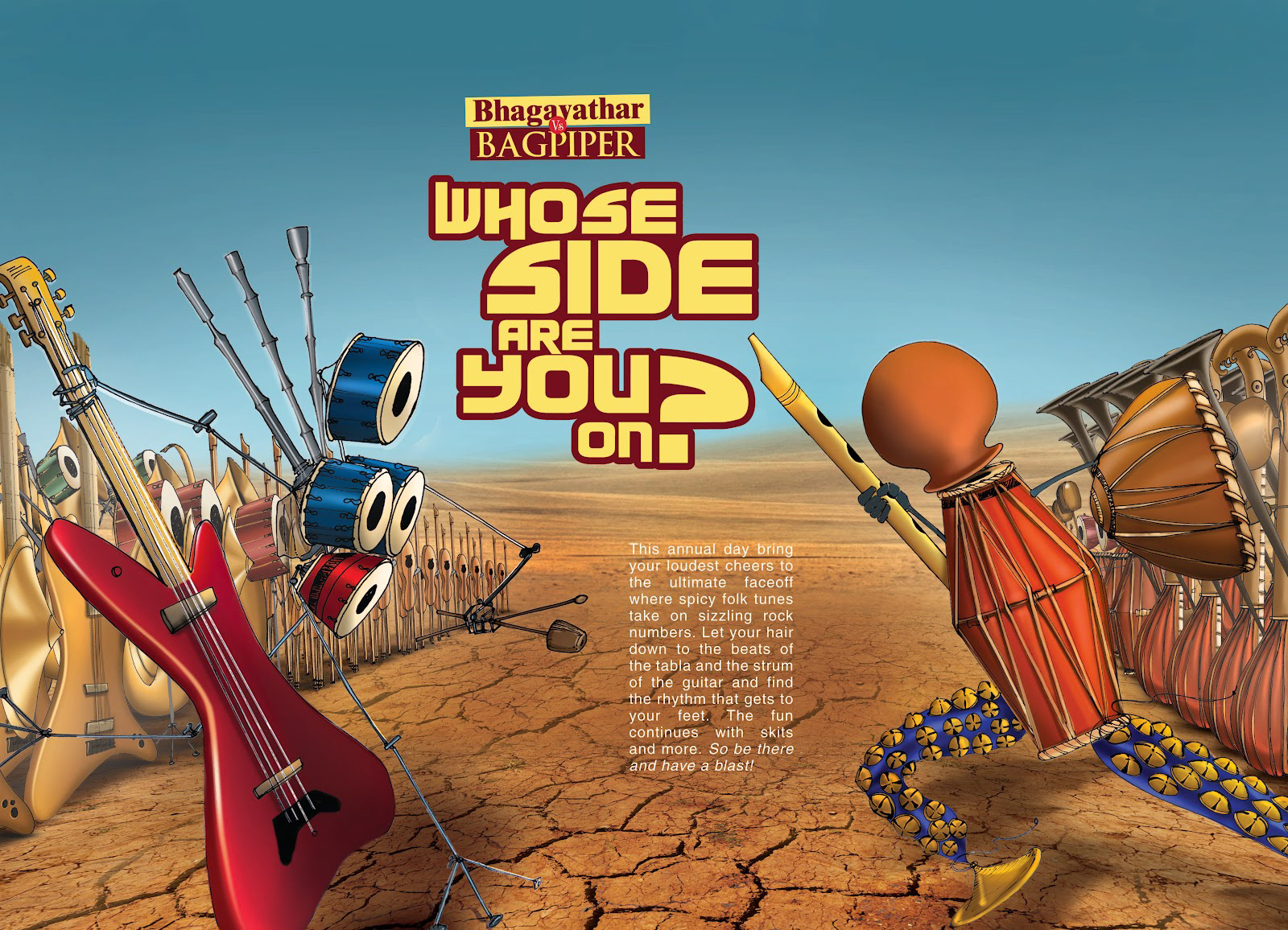 An opportunity to design promotional print posters and social media advertising for traditional Indian music Vs. Western band by lions club. I did the concept and sketch for the poster and came up with this layout design.